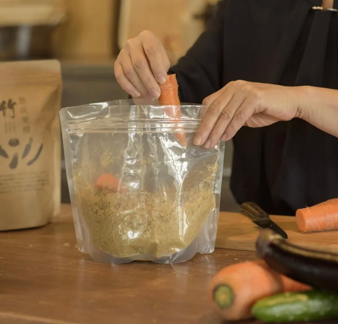 ②①の野菜を竹ぬかどこの袋に入れて漬けます。冬は室温、夏は冷蔵庫の野菜室に入れてください。